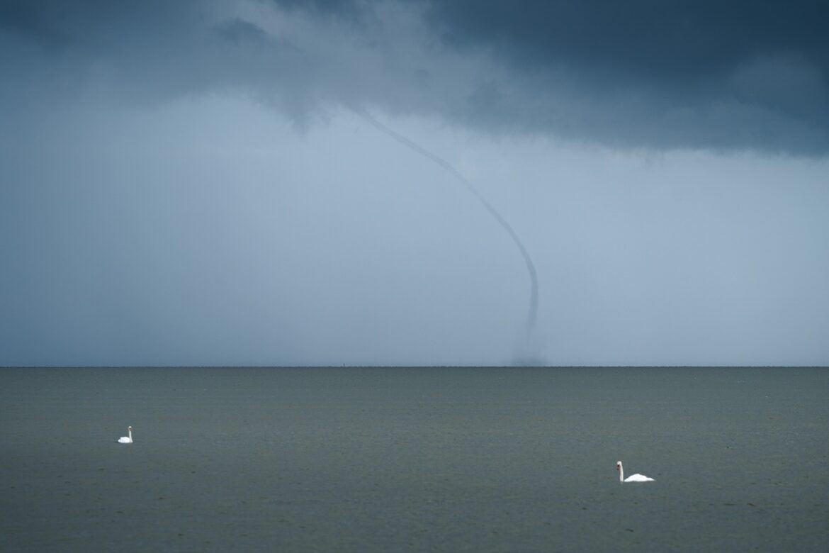 Waterhoos langs strand Hindeloopen tijdens onweersbuien.