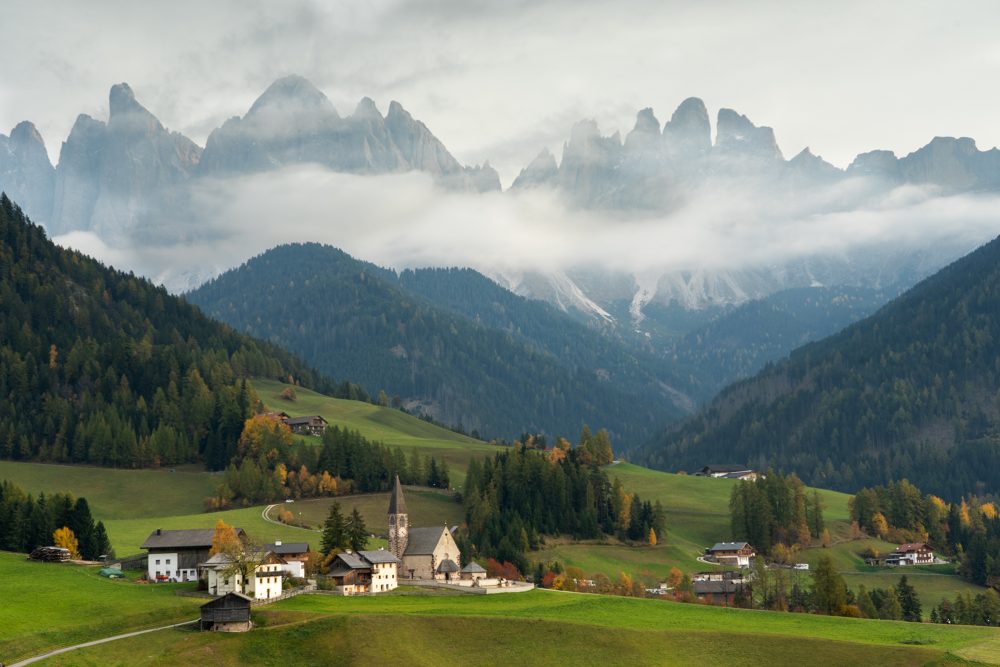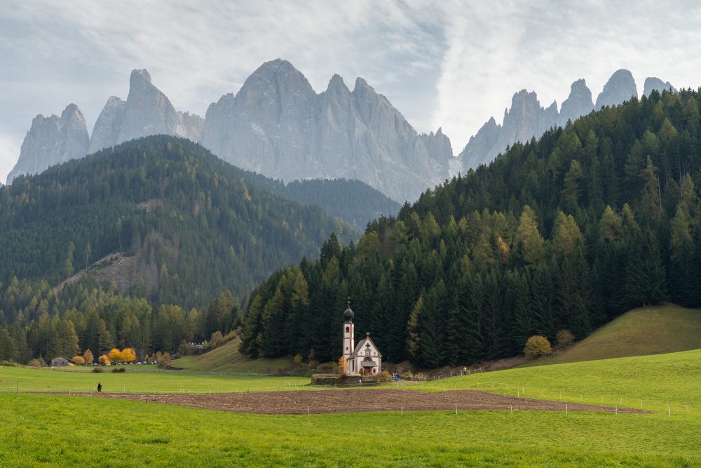 We gaan verder, op naar het het Sint Johann (oftewel Chiesa San Giovanni) kerkje. Een bekende fotospot waarvan ik dacht dat het kerkje er was neergezet door een kunstenaar of een architect, want deze lijnt heel fijn met de bergen! Het omgeploegde veldje “verstoorde” de compositie :).