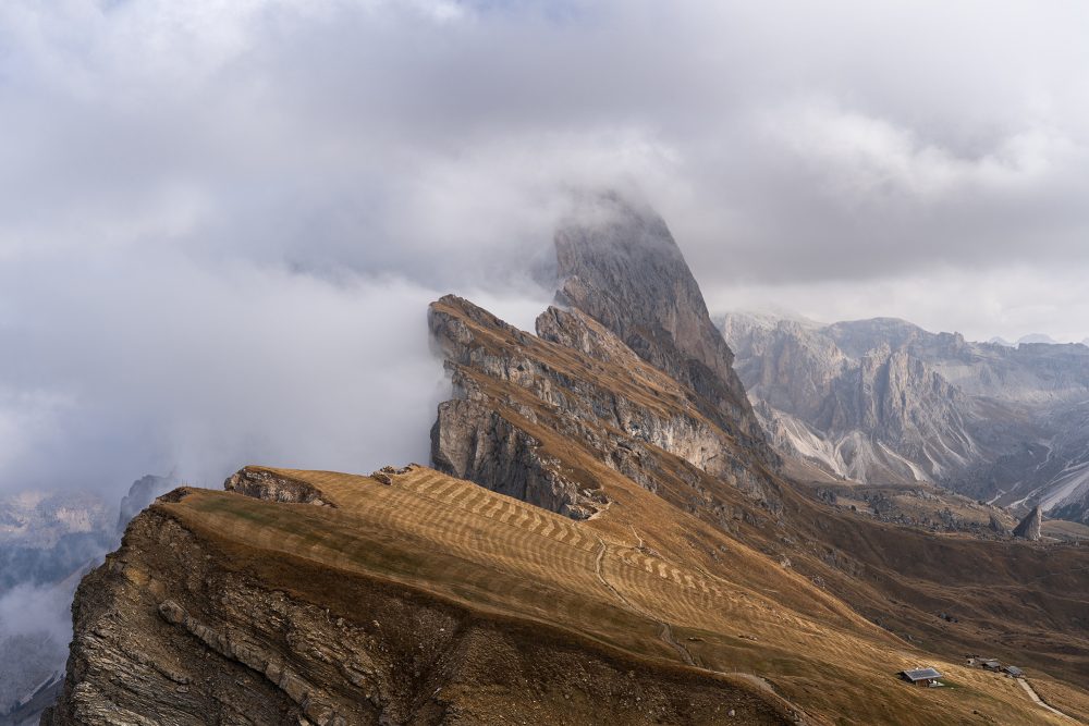 De planning was om Seceda te bezoeken. We besloten te wachten totdat er opklaringen kwamen, en die kwamen. Geen lange wachtrij (weinig tourisme in de herfst) en met de kabelbaan omhoog (veel herfstkleuren onderweg). En dan het uitzicht; De pieken van Seceda steken kaarsrecht de lucht in en hebben een hoogte van 2518 meter.